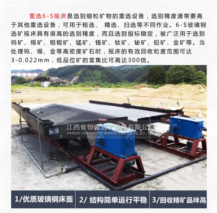 产品概况:6-S摇床是重力选矿的主要设备之一,它广泛应用于选别钨、锡、钽、铌、金和其他稀有金属和贵金属矿。可用于粗选、精选、扫选等不同作业,选别粗砂(2-0.5mm)、细砂(0.5-0.0