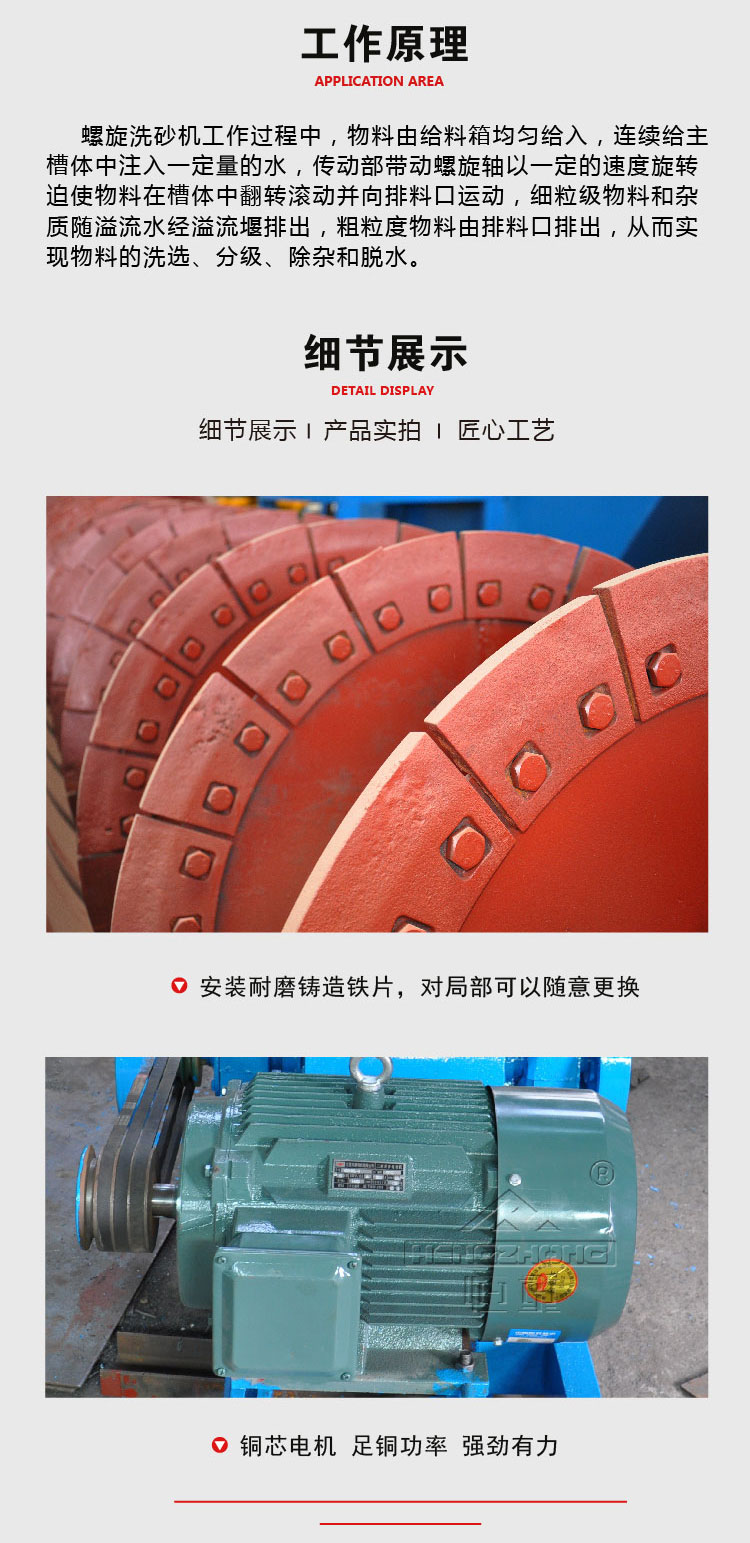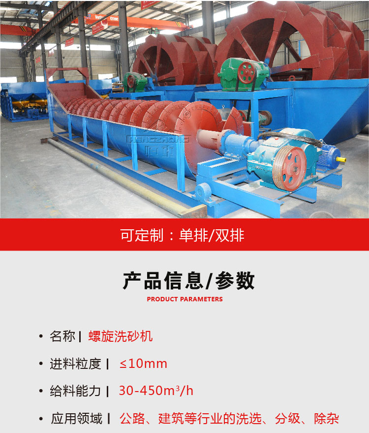 螺旋槽式洗砂机适用於黑色和有色冶金矿山等预选矿石、将矿石用水洗选,以除去原矿中的泥砂等杂质,从而使矿石达到工艺和经济上的要求,广泛用于锰矿脱泥粗选和精选,特别对埋於泥土中的颗粒锰矿石效果最佳。它的处理能力较大是满足大生产力对矿石、石料的清洁度有要求的企业的理想设备。