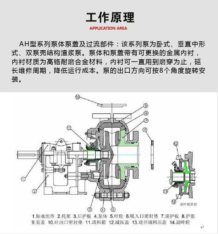 产品概况:该系列泵为卧式、垂直中开式、双泵壳结构,泵体和泵盖带有可更换的金属内衬或橡胶内衬,内衬可一直用到磨穿为止,不用更换,延长维修周期,降低运行成本。泵的出口方向可按8个角度旋转安装。