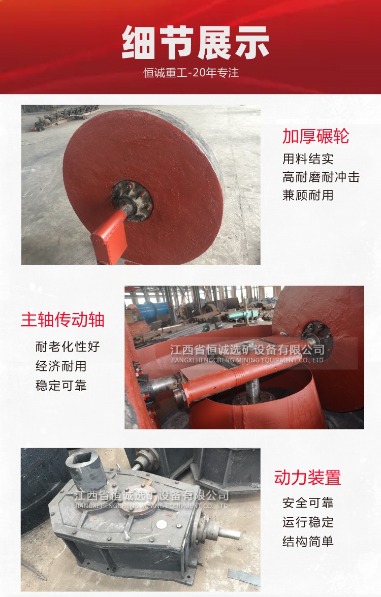 我厂生产的碾金机,在结构上合理吸收了国内选矿机械的特点,通过精心设计制成,采用硬齿面一体式减速箱,相比老式的汽车后桥和开式齿轮传动,具有寿命长、使用安全可靠、维护方便、结构简单、维修更换方便等优点。